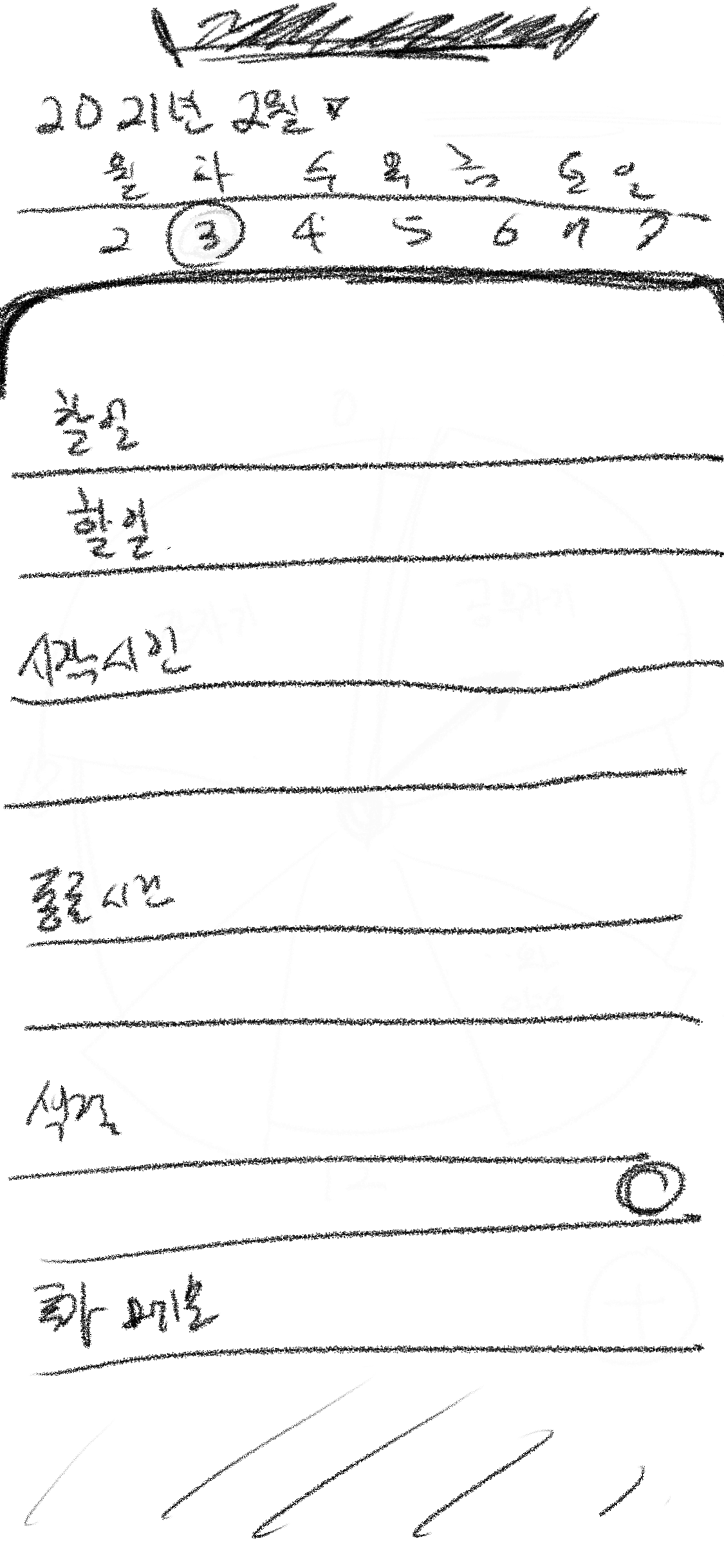 과거 어릴 적 방학 계획표를 참고하여 아이패드를 사용하여 간단한 러프를 만들어보았다.(발로 그린 거 아닙니다..) 상단에는 날짜를 고를 수 있으며 하단의 +버튼을 누르면 할 일을 등록한다. 등록된 일정은 원형으로 표시된다.