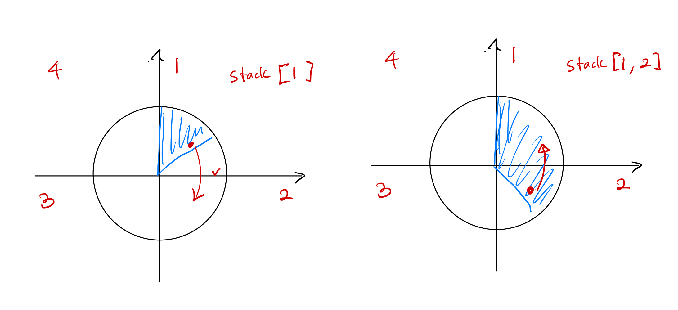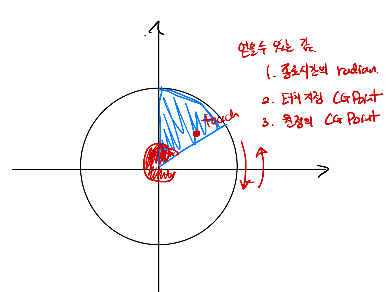 해결방안으로 값이 크게 튈 때 드래그 방향을 파악하는 방법으로 해결하였다. 제스처 객체를 통해서 얻을 수 있는 정보로는 방향을 알 수 없기 때문에 원을 4개의 분면으로 나누어 스택 구조를 활용하였다. 값이 크게 튈 때 스택을 확인하여 지나온 분면을 확인, 어느 방향에서 드래그되어온 것인지 알 수 있게 되었다.