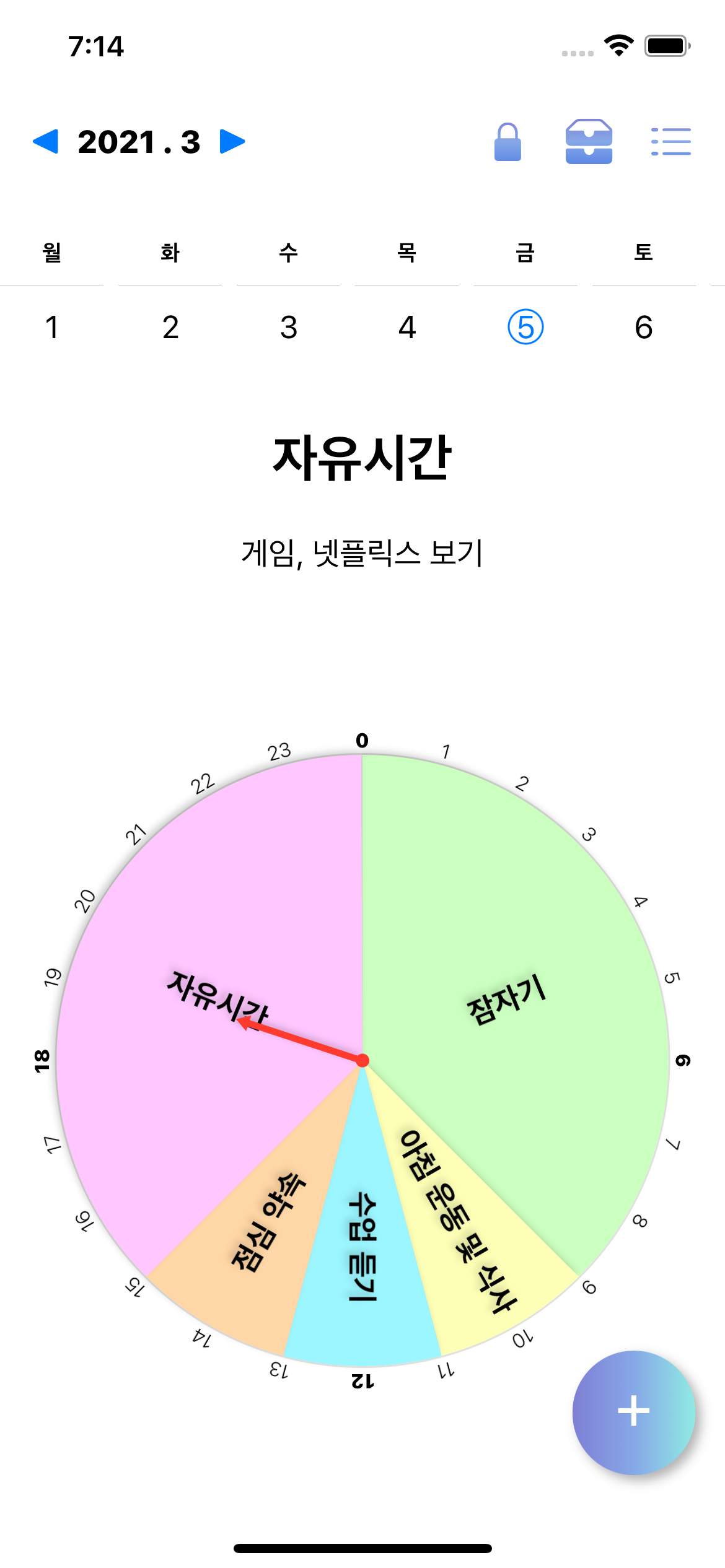 - 일정들을 추가, 삭제, 수정 가능, 각 일정마다 색깔 지정, 원형으로 표시