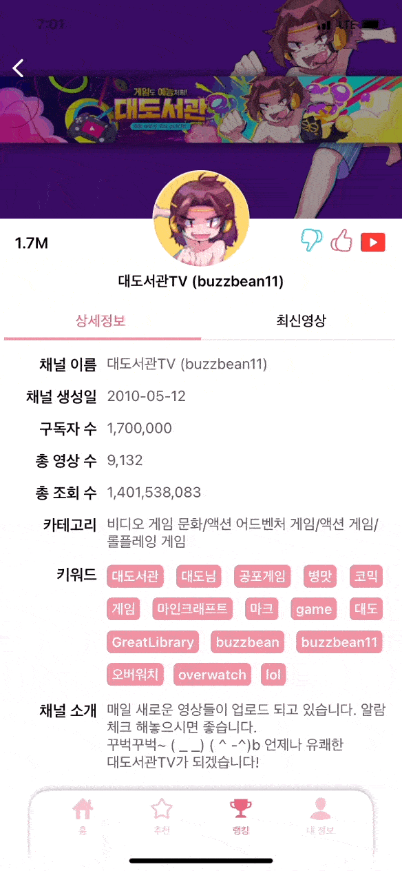 위의 3번째 스크린숏 채널 상세페이지를 보면 목록을 위로 스크롤하면 상단의 채널 정보가 사라지고 채널 제목만 navigation bar에 남는 것을 확인할 수 있다. 이는 ScrollviewDelegate에서 위치 값을 계산하여 이에 맞게 상단의 뷰들을 사라지게 하였다. 이외에도 랜덤 페이지의 Custom CardView와 그 안의 Tag 목록을 CollectionView로 구현하였다. 랭킹 페이지와 같이 RestApi 통신이 필요한 리스트의 경우 모두 Paging 기능을 추가하였다.